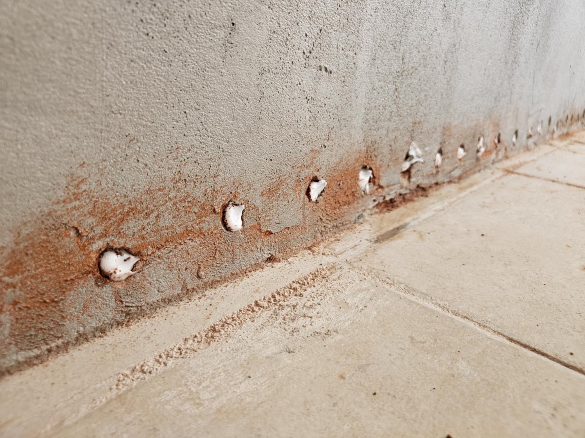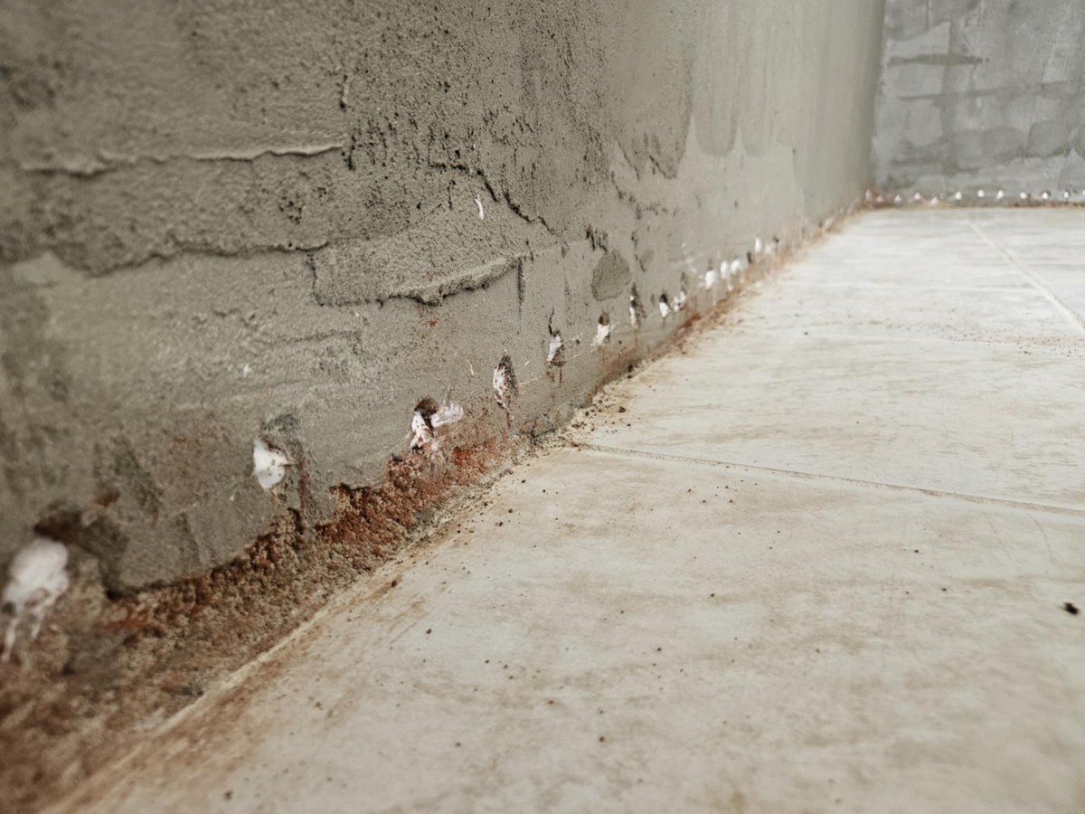 A munkát megelőző bejárás során örömmel tapasztaltuk, hogy a régi, nedvességtől károsodott vakolat eltávolítása és az érintett falak újravakolása megtörtént. Ez azért fontos, mert így a falazattal együtt a friss vakolat is képes volt befogadni az injektáló anyagot. Fontos szempont, hogy az új vakolat kellő száradás (4-5 nap) után kerüljön injektálásra – így biztosítva az optimális terjedést és hatékonyságot.