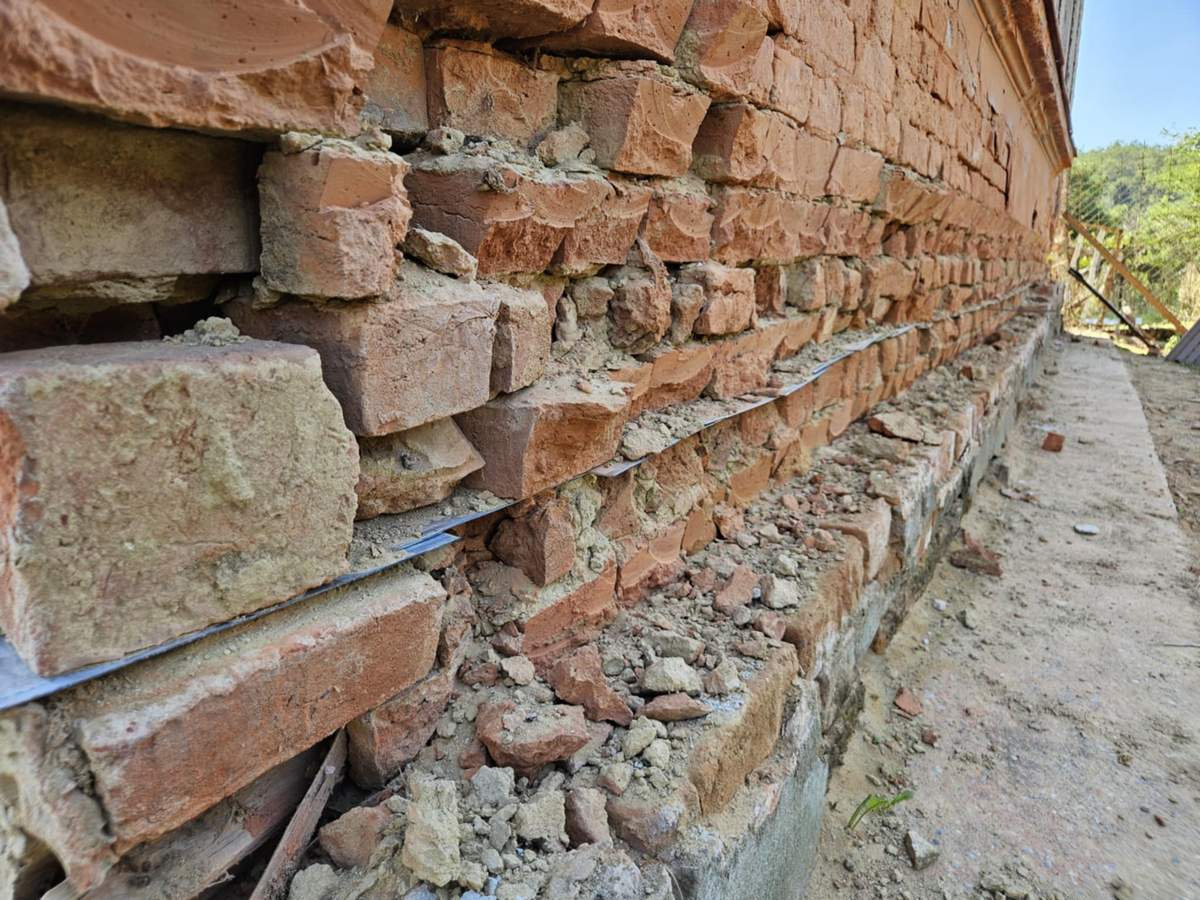 A tulajdonos utcafronti hőszigetelést is tervez, ezért lefaragták és részben lebontották az egykor utólag épített, megerősített lábazati fal egyes téglasorait. Ez a célzott bontás lehetővé tette számunkra, hogy könnyedén hozzáférjünk a szükséges fugasíkhoz, és biztosítottuk a vízszigetelő lemezek megfelelő bejuttatását.