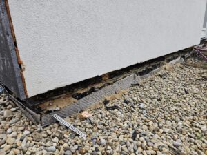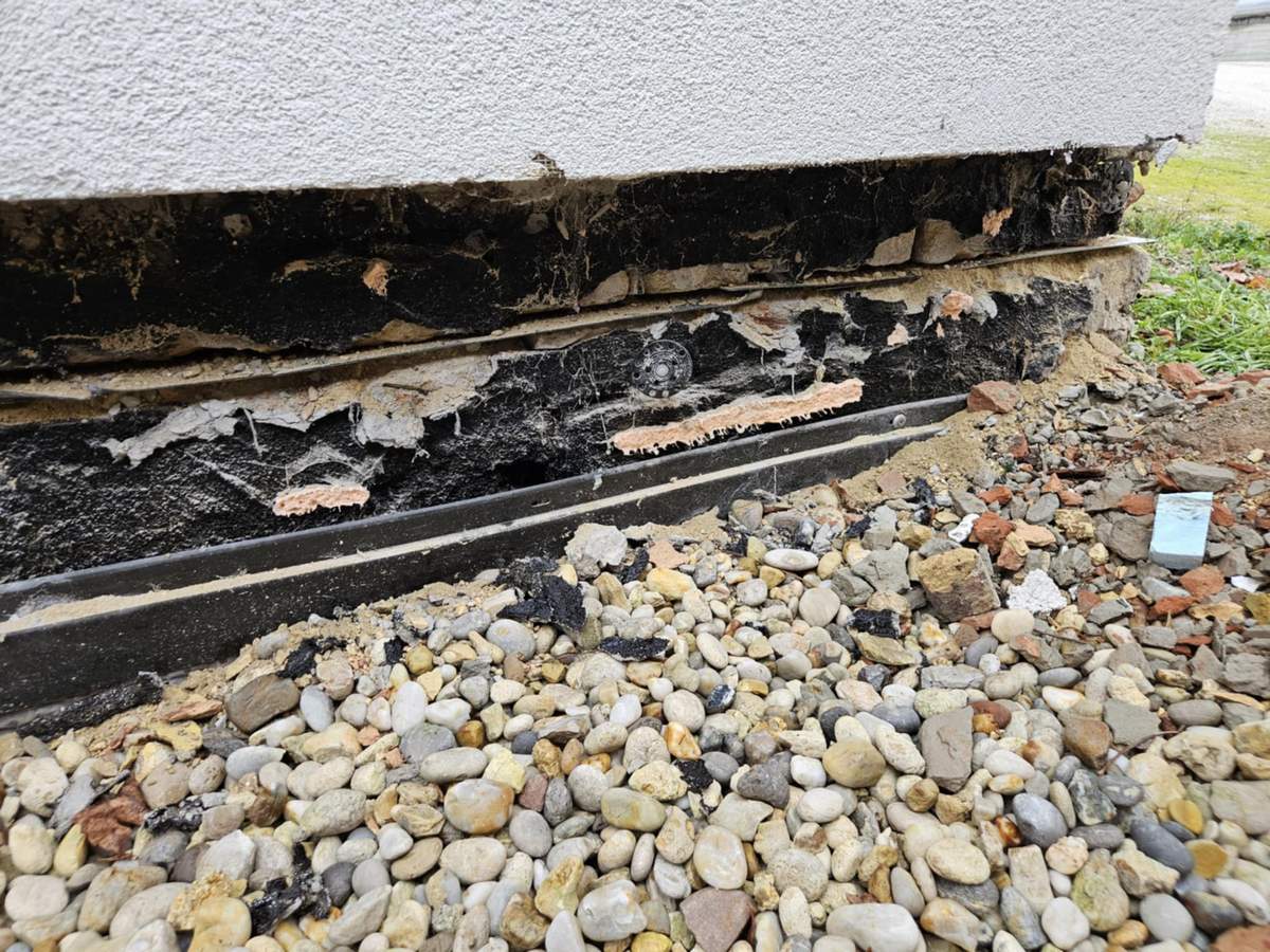 Sok hasonló épületnél a lakótér padlója és a külső terepszint egy magasságban van – ilyenkor szakszerűen kialakított, 50–60 cm mélységig szellőző kavicságyas rendszerre van szükség, amely „hamis lábazatként” működik.