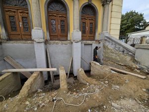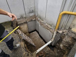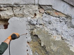 Továbbá a pillérek függőleges injektálásával leválasztottuk azokat az épülettömb többi részéről, hogy a víz ne juthasson át a pilléreken keresztül a főfalakba.