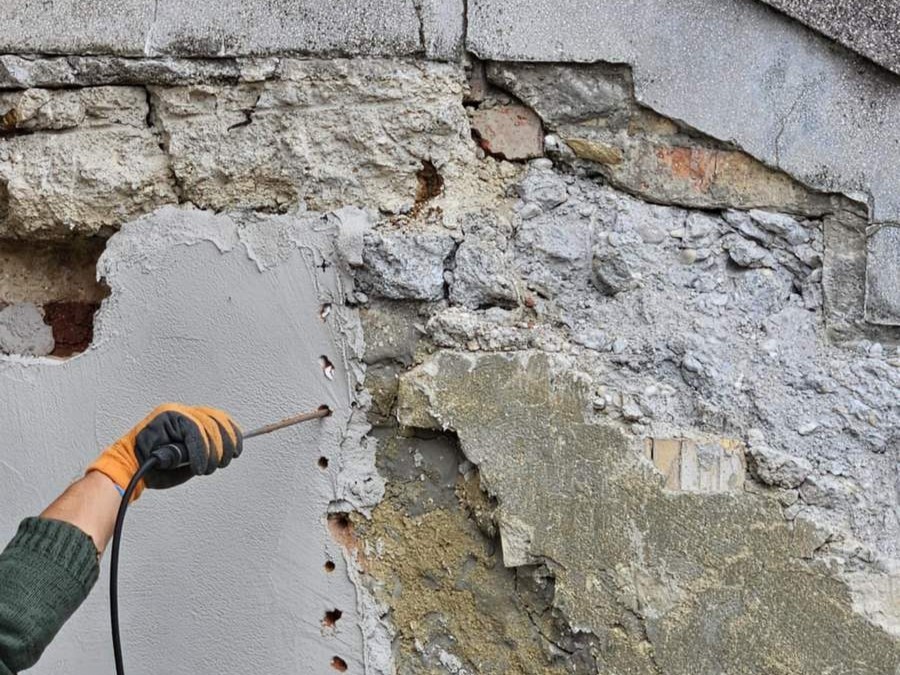 Külön kihívást jelentett a házhoz toldott, masszív tégla kerítéstömb, amely a fal síkjában csatlakozik az épülethez. Itt függőleges injektálással zártuk el a víz szivárgásának lehetőségét, megakadályozva, hogy a kerítés falszerkezete oldalról átnedvesítse az épület főfalát.